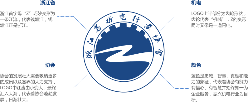 浙江省機電行業協會Logo以浙江首字母Z為原型巧妙變形為一條代表著浙江的錢塘江江流,江流整體形狀由小變大寓意著協會不斷吸納更多優秀成員由小變大、蓬勃發展、日益壯大的過程,同時江流的外形也像極一道閃電配合logo上半部分以齒輪寓意的機械完美詮釋了本協會的核心“機電”。并且整體用象征忠誠、自信、智慧、真理和能力的深藍色為主色,寓意著協會有能力、有信心、有智慧并始終如一為企業服務、振興機電行業的終極目標。