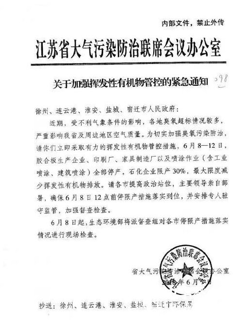 繼山東臨沂之后,江蘇多地開啟全面停工模式!今日,徐州、沭陽等板材之鄉企業收到通知,要求立即停產,停產日期自6月8日12點至6月12日止。要求所有膠合板生產企業、印刷廠、家具制造廠以及噴涂作業全部停產,最大限度減少揮發性有機物排放,并要求供電部門實施精準停電。6月8日起,生態環境部將派督查組對各市停限產措施落實情況進行現場檢查!下午1點督查組從宿遷出發前往沭陽檢查落實情況。